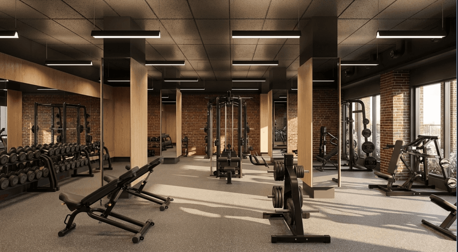 The new gym will be organized into two distinct rooms to better serve our multigenerational community. The entry room is dedicated to cardio and light movement, while the second room focuses on strength, functional training, and stretching. This layout is designed to improve flow and circulation, starting with a practical arrival area at the entrance featuring cubbies and coat storage for residents.
