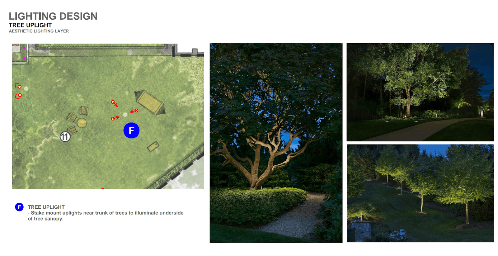 The Canopy Layer: Where rooftop angles cannot reach, particularly under dense tree canopies, we will supplement the moonlighting with low-profile downlights mounted within the trees using adjustable straps that protect tree health.